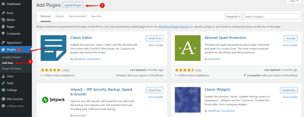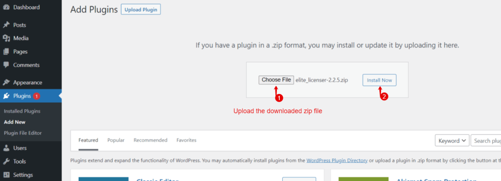 After purchasing Elite Licenser from HasThemes, you will get a Downloadable plugin file and License code. Follow these steps to install and activate the plugin.