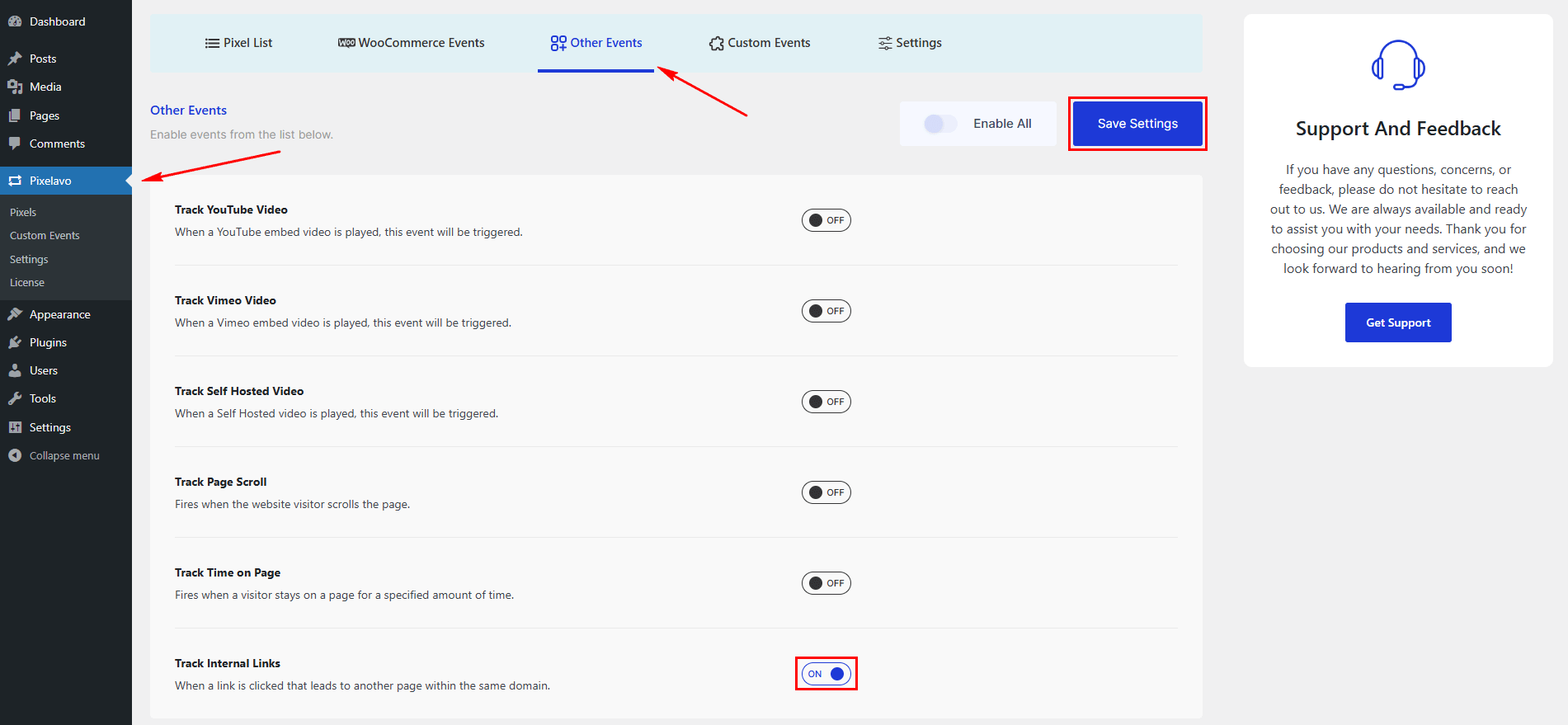 - Navigate to the Pixelavo Plugin Menu:In your WordPress dashboard, go to the Pixelavo plugin menu and select Other Events.