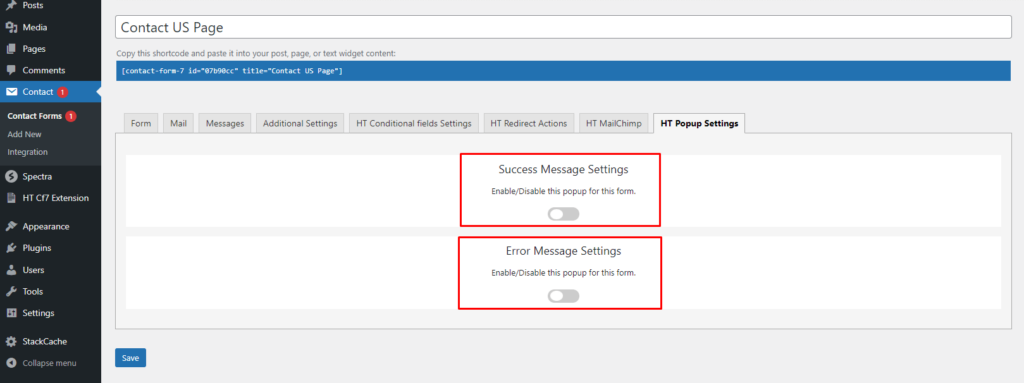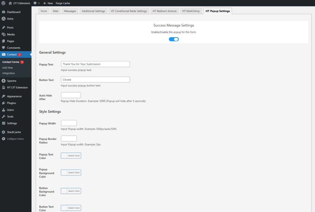 To enable the “Popup Form Response” extension, first, visit the “HT CF7 Extension” menu from your WordPress dashboard.