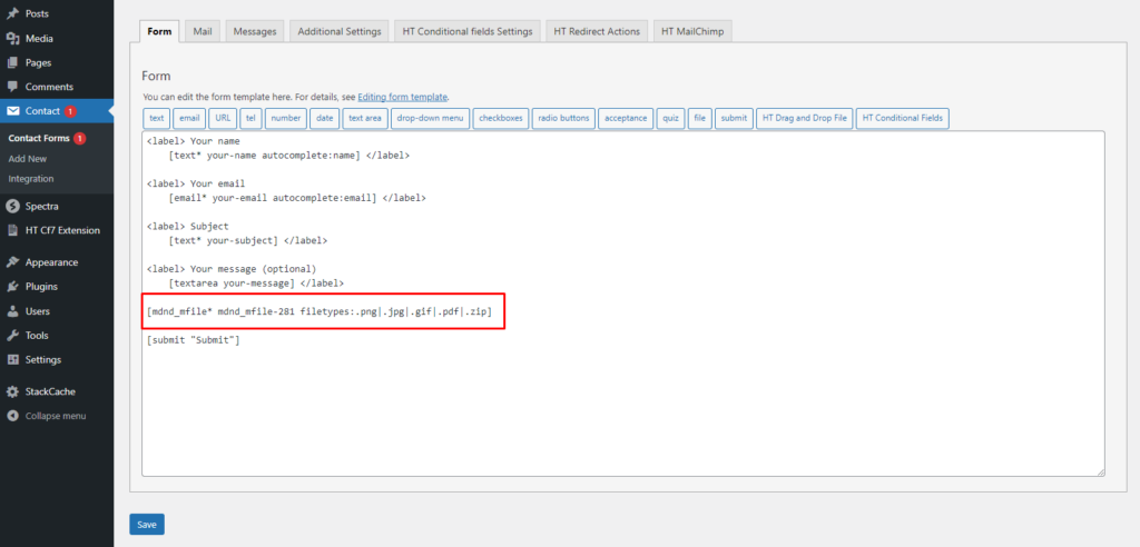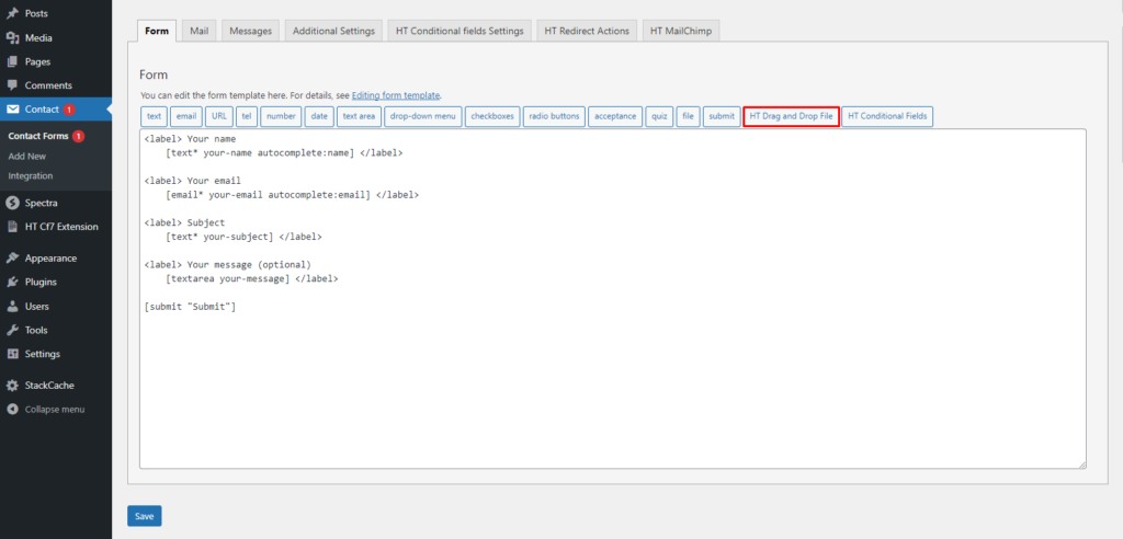 After enabling the extension, when you create or edit a contact form on your website, you will notice a new tag named “HT Drag and Drop File“. Now, you can insert the tag anywhere on your contact form. It will include a drag-and-drop file upload field over there.