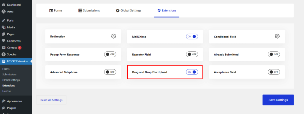 To enable the “Drag and Drop File Upload” extension, go to your dashboard and navigate to the “HT CF7 Extension” menu.