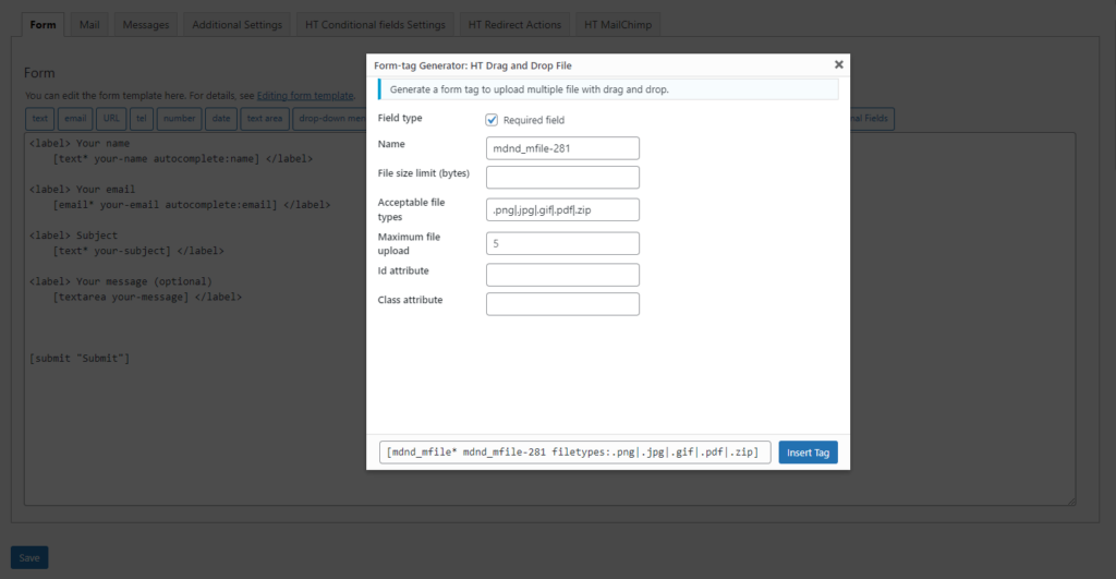 When you click the “HT Drag and Drop File” tag, a popup will appear where you can set up the necessary options before adding a drag-and-drop file upload field.