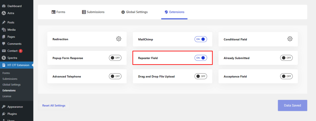 To enable the “Repeater Field” extension, go to “HT CF7 Menu” from your WordPress dashboard and open the “Extensions” tab. Then turn on the switcher option for the “Repeater Field” extension and save the settings.