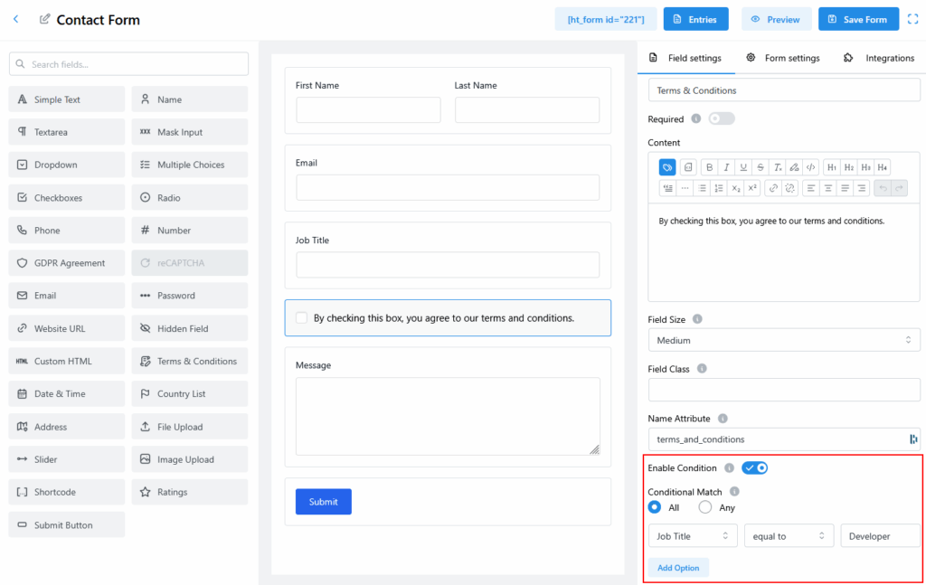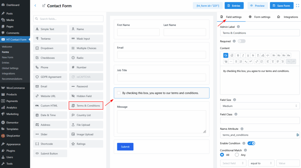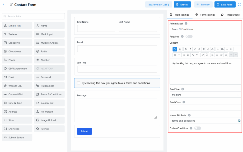 - From the left-side field panel, drag and drop the Terms & Conditions field into your form layout.