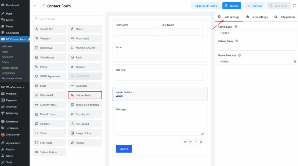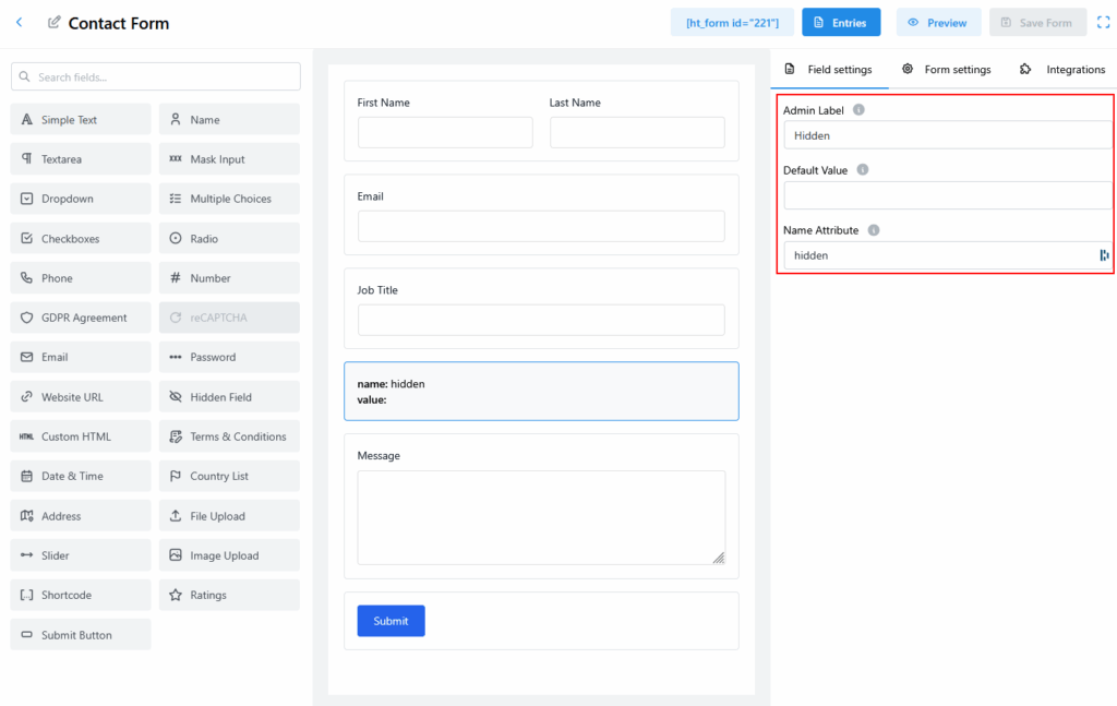 - From the Fields panel on the left, drag and drop the Hidden Field into your form layout.