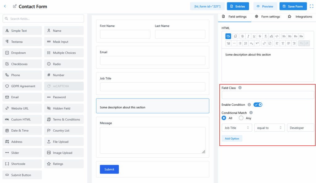 Set rules by selecting a related form field, a comparison operator (e.g., equal to), and a value (e.g., Developer). The HTML content will only appear when the condition is fulfilled.