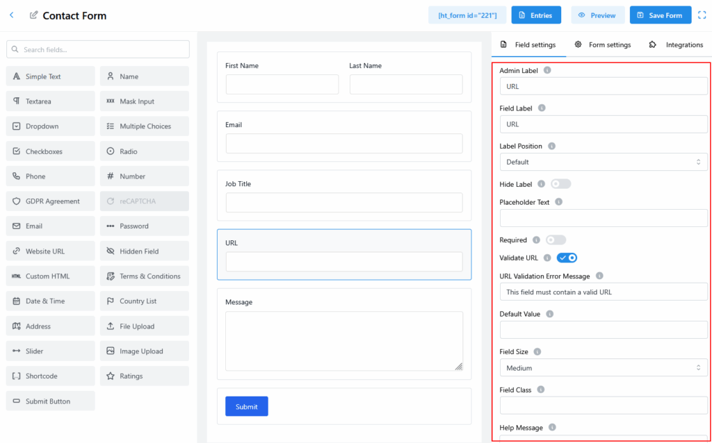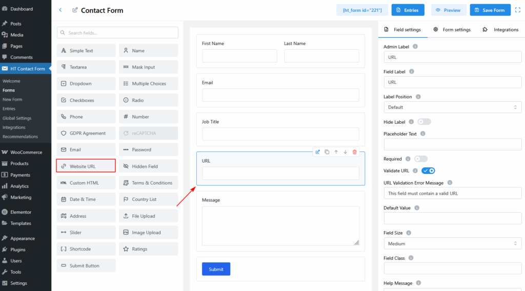 - From the Fields panel on the left, drag the Website URL field into your form layout.