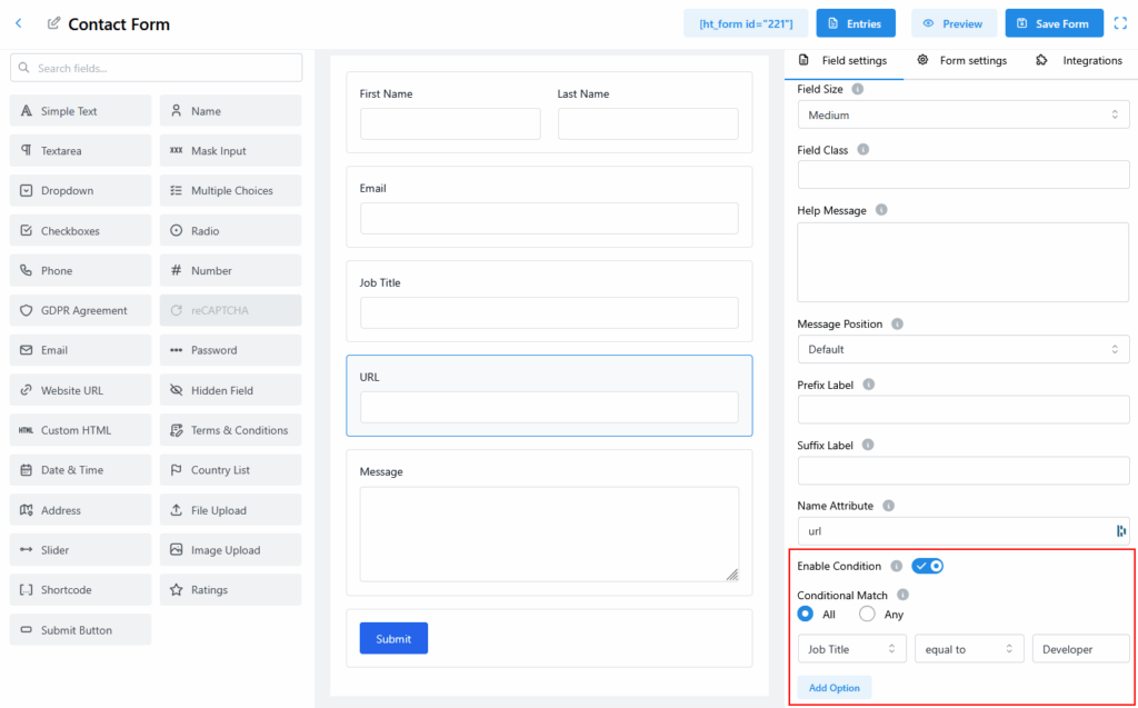 Learn how to add and configure the Website URL field in HT Contact Form. This guide covers field settings, built-in URL validation, conditional logic, and practical use cases to help you effectively collect valid website links from users.
